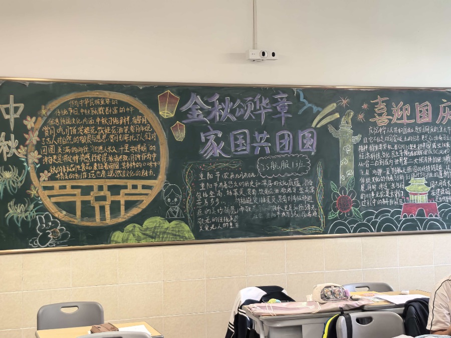 黑板报主题为“金秋颂华章 家国共团圆”,围绕中秋、国庆、重阳展开。中秋作为重要传统节日,承载丰富文化内涵,多样习俗体现人对自然敬畏与感恩,寄托团圆向往,其文化魅力影响深远。国庆是纪念新中国成立的重要节日,见证国家从成立到成为世界重要一极的辉煌历程,经济、科技、文化等蓬勃发展。重阳有悠久历史和深厚底蕴,登高、赏菊等习俗饱含对亲友的美好祝愿,彰显对老人的敬重。愿我们在这金秋时节,共赏盛世美景,共话团圆温情,共贺祖国华诞。