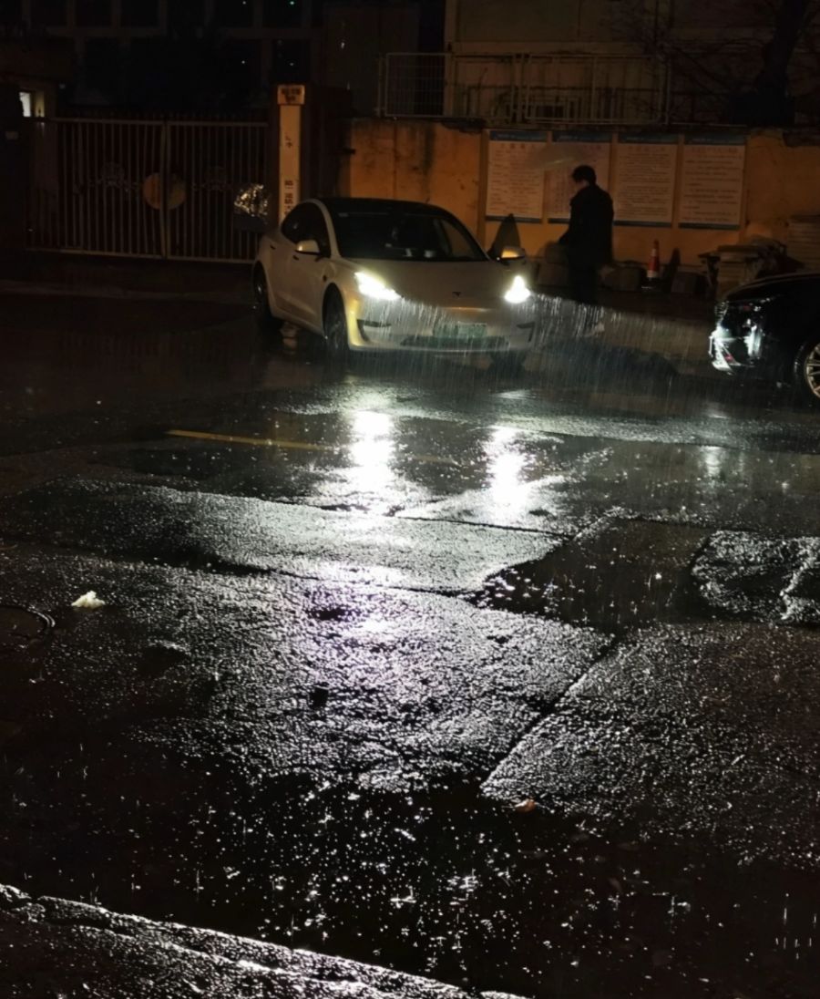 深夜的城市被一场冷雨浸润,湿漉漉的柏油路像一块被擦亮的黑镜,将车灯的暖光、夜色的沉郁尽数揉碎在水洼里。白色特斯拉的车灯刺破雨幕,两道雪亮的光柱劈开沉沉夜色,在漫天雨丝里划出温柔的弧光,灯光落在积水上,又被细密的雨点击碎,漾开一片粼粼的、闪着银辉的光斑,仿佛把整条街都铺成了流动的星河。